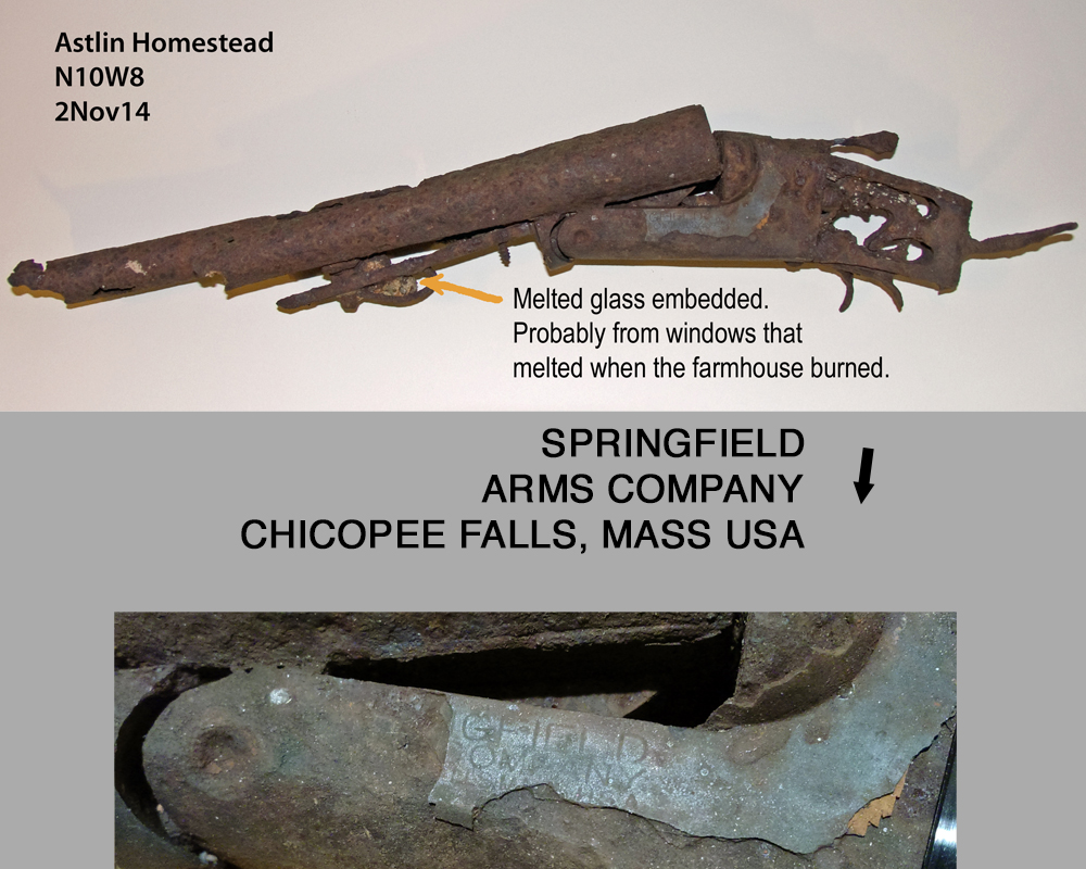 So far we’ve only had one archaeological dig at this site. That was during November 2014. In addition to bits of broken pottery we found the remains of a shotgun! This provided the answer to a question: was the farm abandoned because of the fire, or did the house burn after it was abandoned? The presence of melted glass embedded in the shotgun proves that the gun was in the house when it burned. And therefore, the home was occupied when the fire occurred.