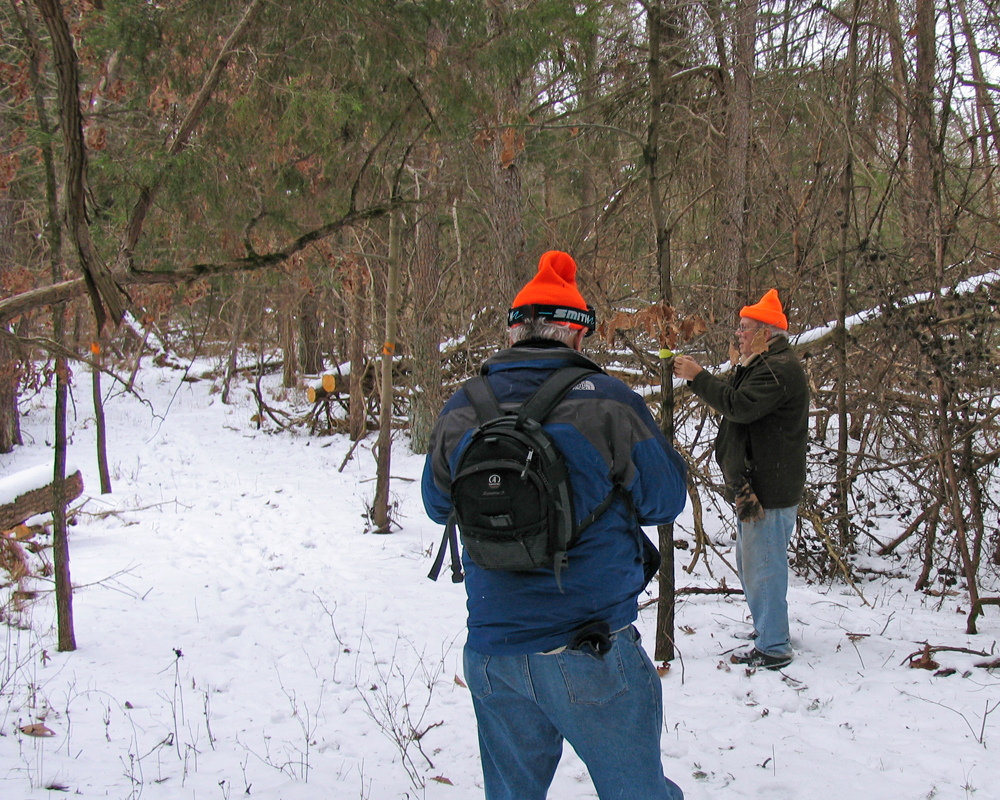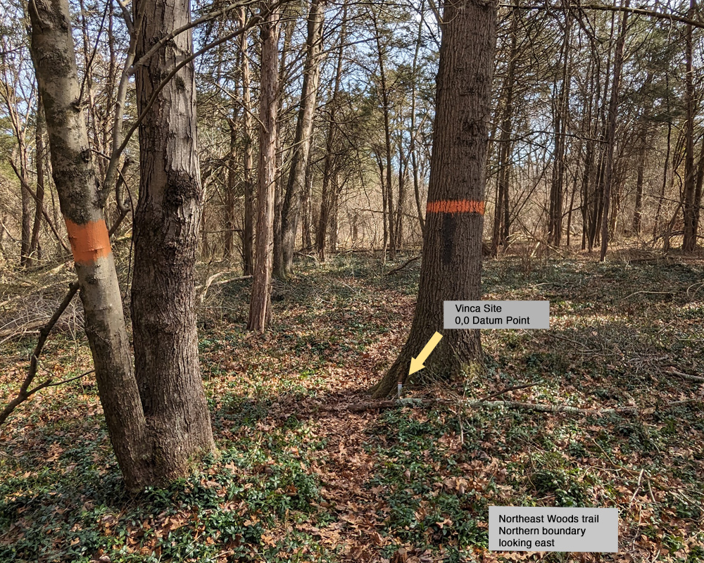 The Vinca Site is about 400 feet northwest of the Homestead Site. Here the Vinca forms roughly a circle with a radius of 80 feet.The zero-zero datum point for this site is marked by a small dowel in the ground next to a tree with an orange blaze. Across the path is a second tree with two trunks and one orange blaze.