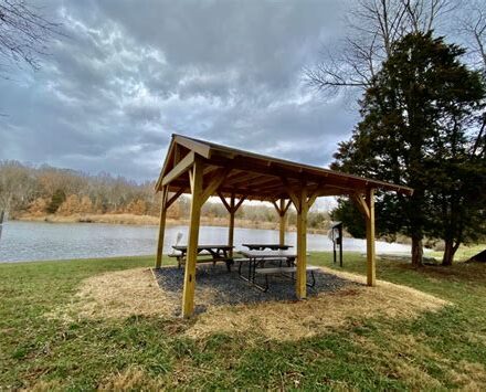 The Big Pond Pavilion sits along the shore of our Chapter’s two-acre Big Pond, offering members and guests a rustic, sheltered spot to enjoy the outdoors. Built in 2019 under the leadership of volunteers, the 12′ × 16′ wooden structure provides shade and cover for anglers, families, and hikers. With its open sides and simple roofline, the pavilion blends naturally into its surroundings while giving visitors a comfortable place to pause, picnic, or escape the elements. From its vantage point, you can watch the water change with the seasons, observe herons, frogs, or turtles along the shoreline, and enjoy the peace of this natural setting.
