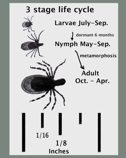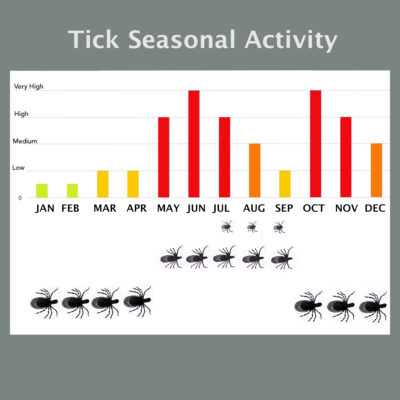 Ticks are common in our region and pose serious health risks because they can transmit diseases like Lyme disease, Rocky Mountain spotted fever, anaplasmosis, babesiosis, and even trigger red meat allergies. Their size varies throughout their three-stage life cycle, and activity levels change with the seasons.